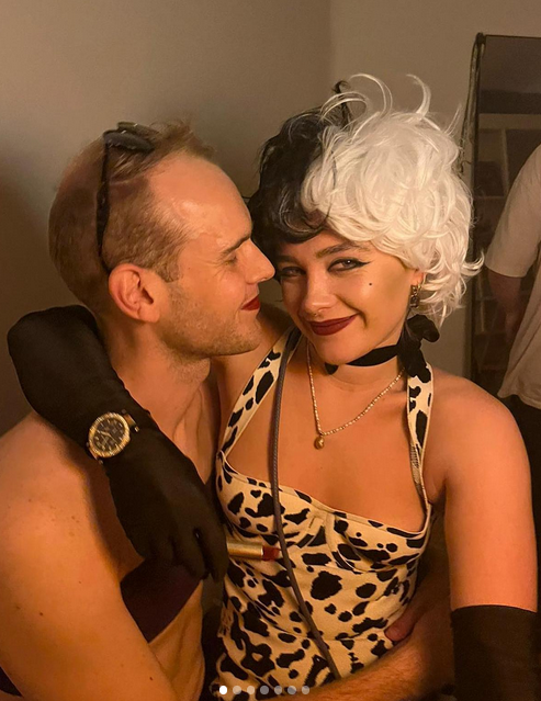 Florence Pugh in a playful, character-inspired look, with her long black gloves once again taking center stage.