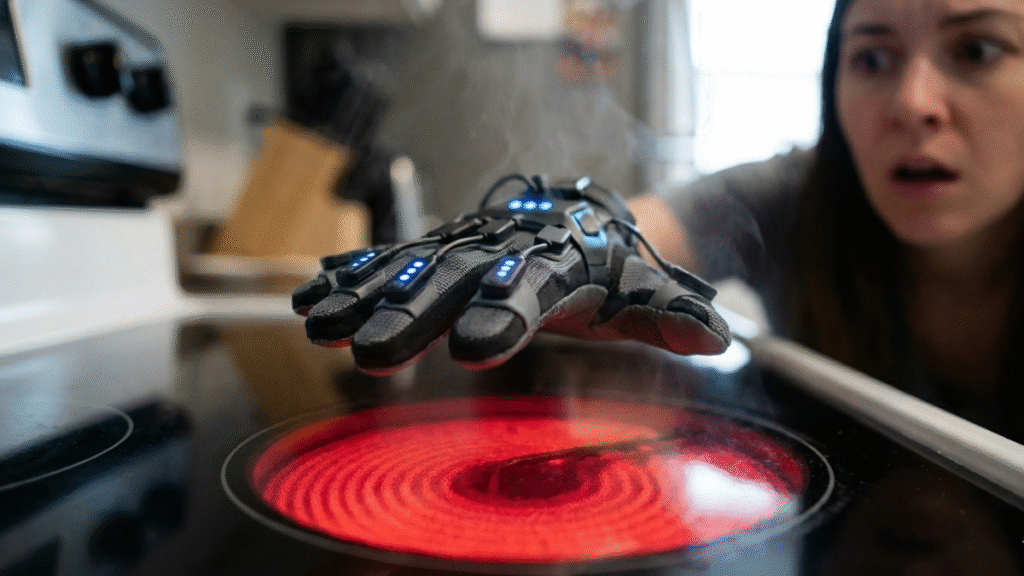 These smart gloves collect data through sensors, analyze the environment in real time, and send feedback signals back to the user. In simple terms, they try to replicate what human skin naturally does every second — sensing, processing, and responding.